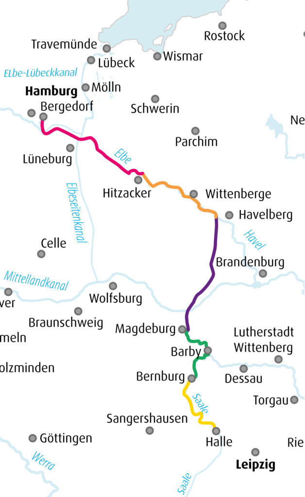 Erleben Sie auf dieser sechstägigen Reise die beiden Hauptmerkmale der Flüsse Elbe und Saale, die sowohl für die Naherholung als auch den Handel eine bedeutsame Rolle spielen. So verbindet diese Reise wunderschöne, naturbelassene Flusslandschaften mit wichtigen Handels und Industriestandorten wie z. B. Hamburg, Magdeburg und Halle miteinander. Diese Reise vereint Erholung und Erleben, Fluss und Stadt, Entspannung und Entdecken.