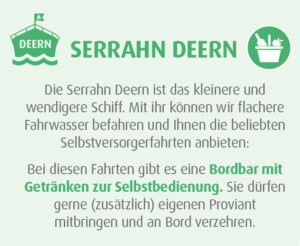 Je nach Teilstrecke ändern sich die Uhrzeiten und die Reihenfolge aber diese kontrastreiche Tour wird Sie in jeder Fahrtrichtung begeistern. Ob morgens von Bergedorf mit Frühstück an Bord nach Hamburg oder erst den Bummel in Hamburg machen und anschließend mit uns zurück nach Bergedorf fahren – diese vielseitige Fahrt ist aus jeder Perspektive ein Highlight!